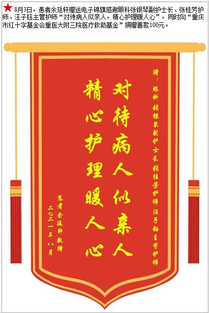 患者余廷轩赠送电子锦旗感谢眼科张银琴副护士长等人,并向医疗救助基金捐赠善款100元-锦旗-患者心声-患者服务-重庆医科大学附属第三医院【官方网站】