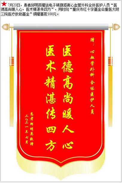 患者邱明英赠送电子锦旗感谢心血管外科全体医护人员,并向医疗救助基金捐赠善款100元-锦旗-患者心声-患者服务-重庆医科大学附属第三医院【官方网站】