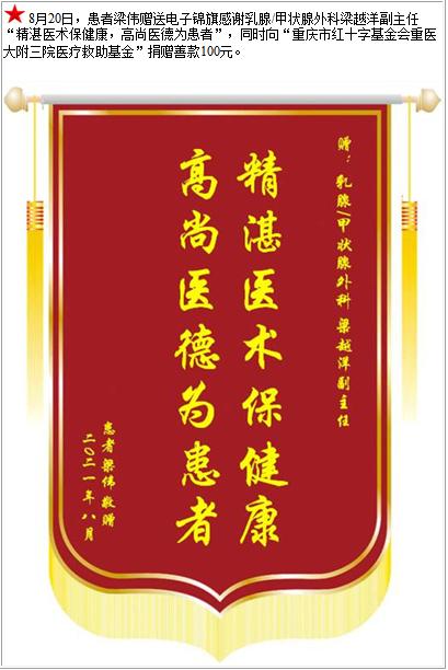 患者梁伟赠送电子锦旗感谢乳腺/甲状腺外科梁越洋副主任,并向医疗救助基金捐赠善款100元-锦旗-患者心声-患者服务-重庆医科大学附属第三医院【官方网站】