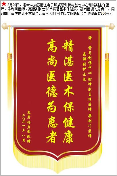 患者林启蓉赠送电子锦旗感谢骨与创伤中心谢峰副主任医师等人,并向医疗救助基金捐赠善款300元-锦旗-患者心声-患者服务-重庆医科大学附属第三医院【官方网站】