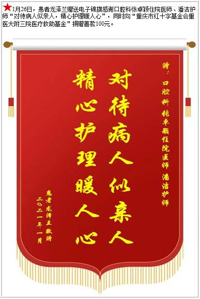 患者龙泽兰赠送电子锦旗感谢口腔科张卓颖住院医师等人,并向医疗救助基金捐赠善款100元-锦旗-患者心声-患者服务-重庆医科大学附属第三医院【官方网站】