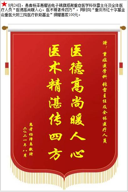 患者杨泽惠赠送电子锦旗感谢重症医学科张雷主任及全体医疗人员,并向医疗救助基金捐赠善款100元-锦旗-患者心声-患者服务-重庆医科大学附属第三医院【官方网站】