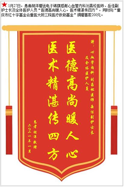 患者胡洋赠送电子锦旗感谢心血管内科刘昌松医师等人及全体医护人员,并向医疗救助基金捐赠善款200元-锦旗-患者心声-患者服务-重庆医科大学附属第三医院【官方网站】