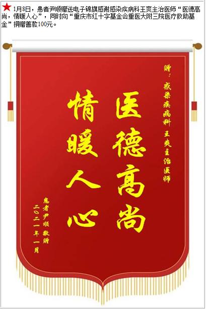 患者尹顺赠送电子锦旗感谢感染疾病科王爽主治医师,并向医疗救助基金捐赠善款100元-锦旗-患者心声-患者服务-重庆医科大学附属第三医院【官方网站】