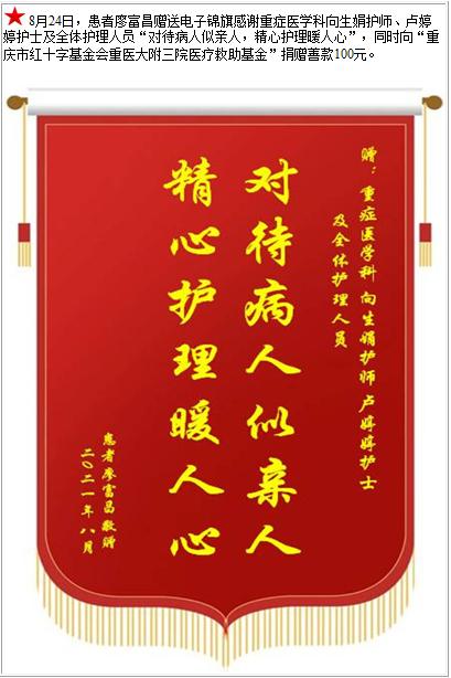 患者廖富昌赠送电子锦旗感谢重症医学科向生娟护师等人及全体护理人员,并向医疗救助基金捐赠善款100元-锦旗-患者心声-患者服务-重庆医科大学附属第三医院【官方网站】
