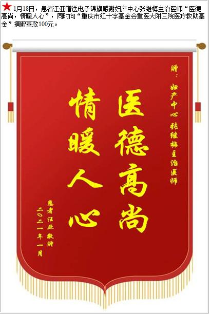 患者汪亚赠送电子锦旗感谢妇产中心张继梅主治医师,并向医疗救助基金捐赠善款100元-锦旗-患者心声-患者服务-重庆医科大学附属第三医院【官方网站】
