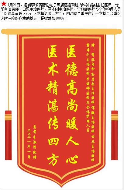 患者李淑清赠送电子锦旗感谢肾脏内科孙岩副主任医师等人及全体护理人员,并向医疗救助基金捐赠善款1000元-锦旗-患者心声-患者服务-重庆医科大学附属第三医院【官方网站】