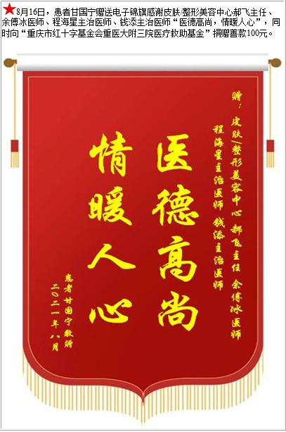 患者甘国宁赠送电子锦旗感谢皮肤/整形美容中心郝飞主任等人,并向医疗救助基金捐赠善款100元-锦旗-患者心声-患者服务-重庆医科大学附属第三医院【官方网站】