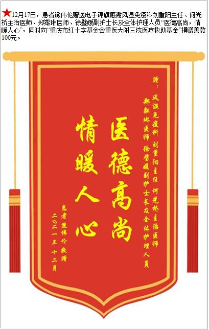 患者熊伟伦赠送电子锦旗感谢风湿免疫科刘重阳主任等人及全体护理人员,并向医疗救助基金捐赠善款100元-锦旗-患者心声-患者服务-重庆医科大学附属第三医院【官方网站】