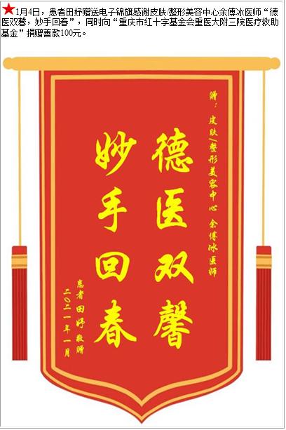 患者田妤赠送电子锦旗感谢皮肤/整形美容中心余傅冰医师,并向医疗救助基金捐赠善款100元-锦旗-患者心声-患者服务-重庆医科大学附属第三医院【官方网站】