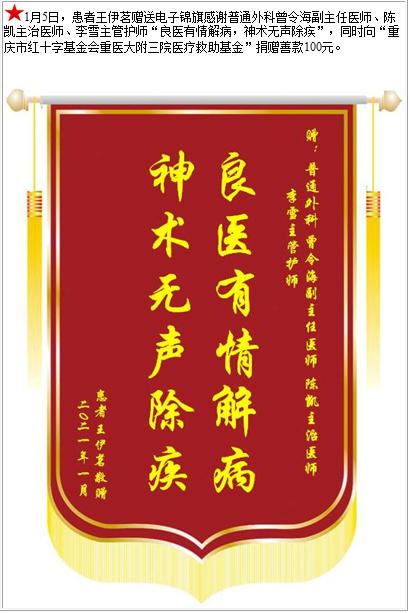 患者王伊茗赠送电子锦旗感谢普通外科曾令海副主任医师等人,并向医疗救助基金捐赠善款100元-锦旗-患者心声-患者服务-重庆医科大学附属第三医院【官方网站】