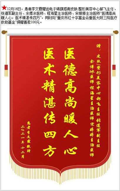 患者李文霞赠送电子锦旗感谢皮肤/整形美容中心郝飞主任等人,并向医疗救助基金捐赠善款100元-锦旗-患者心声-患者服务-重庆医科大学附属第三医院【官方网站】