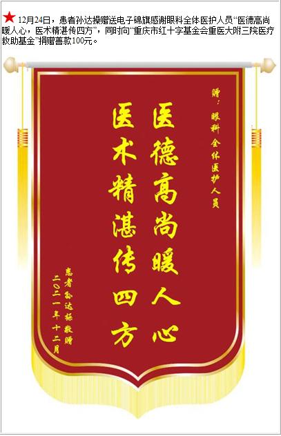 患者孙达操赠送电子锦旗感谢眼科全体医护人员,并向医疗救助基金捐赠善款100元-锦旗-患者心声-患者服务-重庆医科大学附属第三医院【官方网站】