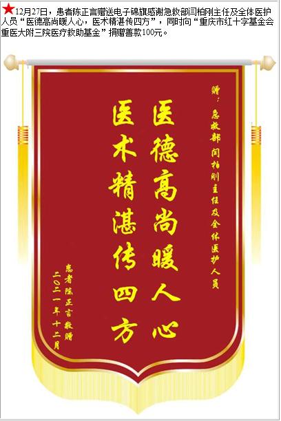 患者陈正言赠送电子锦旗感谢急救部闫柏刚主任及全体医护人员,并向医疗救助基金捐赠善款100元-锦旗-患者心声-患者服务-重庆医科大学附属第三医院【官方网站】
