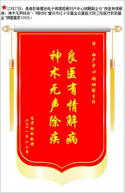 患者彭敏赠送电子锦旗感谢妇产中心胡珊副主任,并向医疗救助基金捐赠善款100元-锦旗-患者心声-患者服务-重庆医科大学附属第三医院【官方网站】