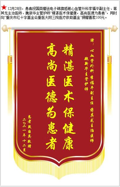 患者段国英赠送电子锦旗感谢心血管外科李福平副主任等人,并向医疗救助基金捐赠善款100元-锦旗-患者心声-患者服务-重庆医科大学附属第三医院【官方网站】