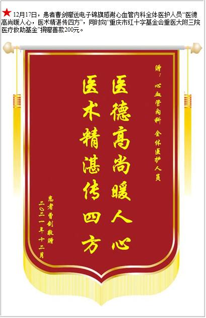 患者曹剑赠送电子锦旗感谢心血管内科全体医护人员,并向医疗救助基金捐赠善款200元-锦旗-患者心声-患者服务-重庆医科大学附属第三医院【官方网站】