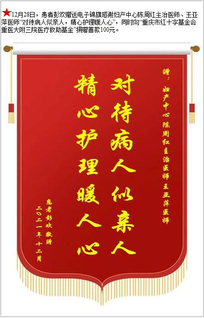 患者彭欢赠送电子锦旗感谢妇产中心陈周红主治医师等人,并向医疗救助基金捐赠善款100元-锦旗-患者心声-患者服务-重庆医科大学附属第三医院【官方网站】