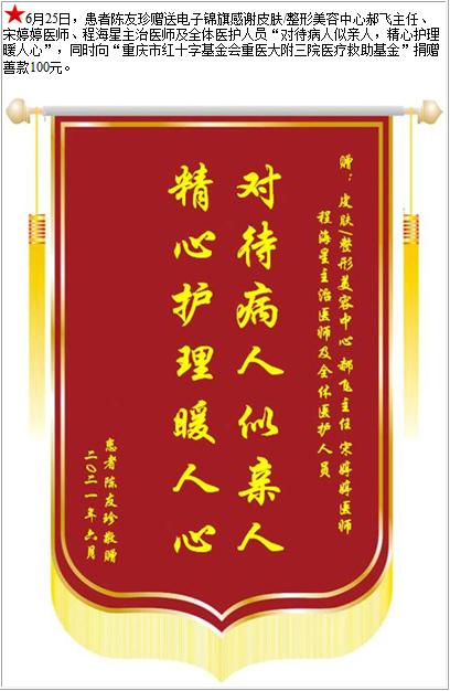 患者陈友珍赠送电子锦旗感谢皮肤/整形美容中心郝飞主任等人及全体医护人员,并向医疗救助基金捐赠善款100元-锦旗-患者心声-患者服务-重庆医科大学附属第三医院【官方网站】