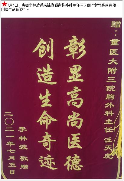 患者李林波送来锦旗感谢胸外科主任汪天虎“彰显高尚医德,创造生命奇迹”-锦旗-患者心声-患者服务-重庆医科大学附属第三医院【官方网站】