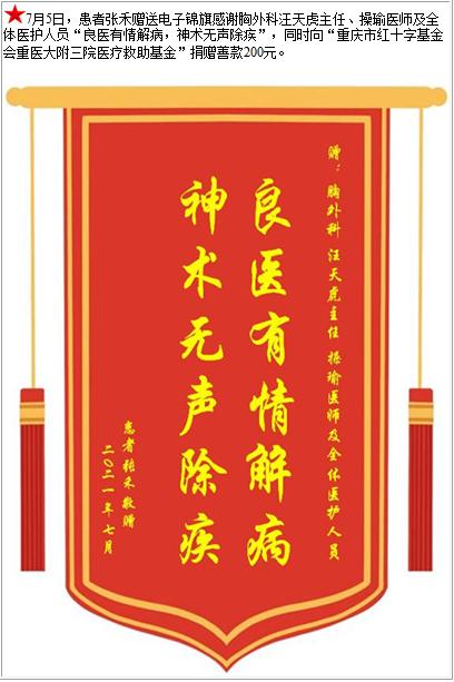 患者张禾赠送电子锦旗感谢胸外科汪天虎主任等人及全体医护人员,并向医疗救助基金捐赠善款200元-锦旗-患者心声-患者服务-重庆医科大学附属第三医院【官方网站】