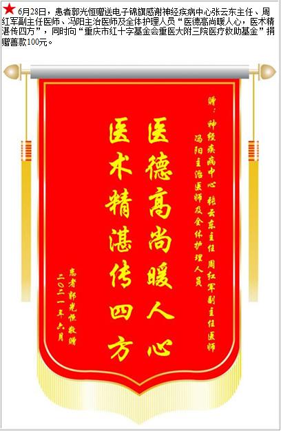 患者郭光恒赠送电子锦旗感谢神经疾病中心张云东主任等人及全体护理人员,并向医疗救助基金捐赠善款100元-锦旗-患者心声-患者服务-重庆医科大学附属第三医院【官方网站】