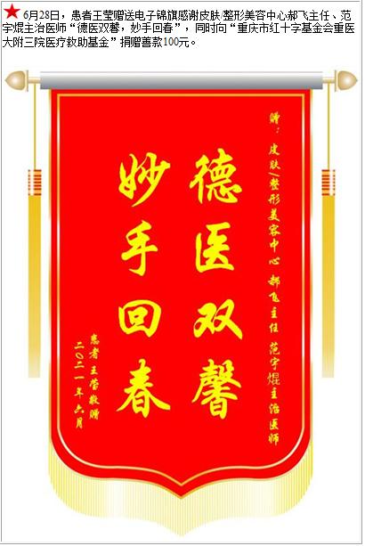 患者王莹赠送电子锦旗感谢皮肤/整形美容中心郝飞主任等人,并向医疗救助基金捐赠善款100元-锦旗-患者心声-患者服务-重庆医科大学附属第三医院【官方网站】