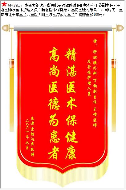 患者索朗达杰赠送电子锦旗感谢肝胆胰外科丁钧副主任等人及全体护理人员,并向医疗救助基金捐赠善款100元-锦旗-患者心声-患者服务-重庆医科大学附属第三医院【官方网站】