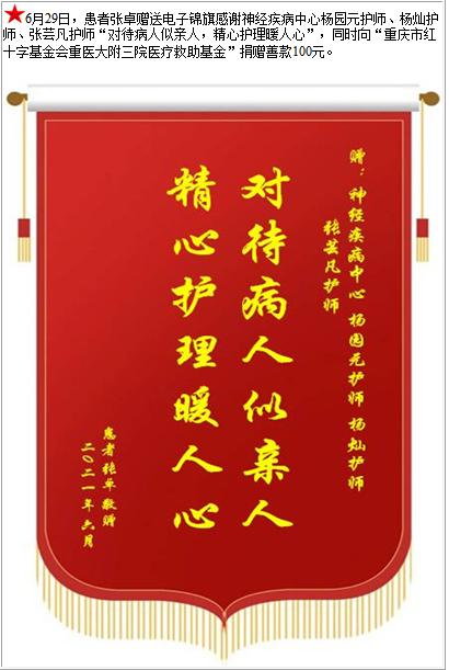 患者张卓赠送电子锦旗感谢神经疾病中心杨园元护师等人,并向医疗救助基金捐赠善款100元-锦旗-患者心声-患者服务-重庆医科大学附属第三医院【官方网站】