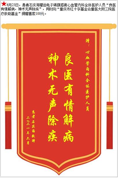 患者石庆海赠送电子锦旗感谢心血管内科全体医护人员,并向医疗救助基金捐赠善款100元-锦旗-患者心声-患者服务-重庆医科大学附属第三医院【官方网站】