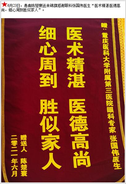 患者陈楚寰送来锦旗感谢眼科张国伟医生“医术精湛医德高尚,细心周到胜似家人”-锦旗-患者心声-患者服务-重庆医科大学附属第三医院【官方网站】