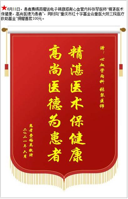 患者费锡英赠送电子锦旗感谢心血管内科张琴医师,并向医疗救助基金捐赠善款100元-锦旗-患者心声-患者服务-重庆医科大学附属第三医院【官方网站】