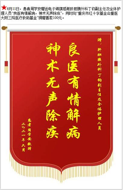 患者周学安赠送电子锦旗感谢肝胆胰外科丁钧副主任及全体护理人员,并向医疗救助基金捐赠善款100元-锦旗-患者心声-患者服务-重庆医科大学附属第三医院【官方网站】