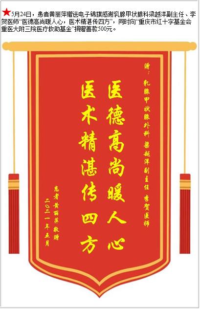 患者黄丽萍赠送电子锦旗感谢乳腺甲状腺科梁越洋副主任等人,并向医疗救助基金捐赠善款500元-锦旗-患者心声-患者服务-重庆医科大学附属第三医院【官方网站】