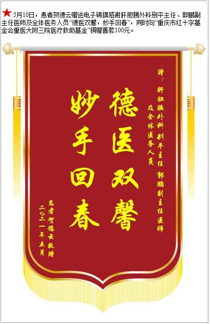 患者贺德云赠送电子锦旗感谢肝胆胰外科别平主任等人及全体医务人员,并向医疗救助基金捐赠善款100元-锦旗-患者心声-患者服务-重庆医科大学附属第三医院【官方网站】