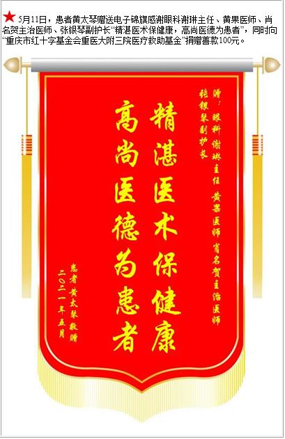 患者黄太琴赠送电子锦旗感谢眼科谢琳主任等人,并向医疗救助基金捐赠善款100元-锦旗-患者心声-患者服务-重庆医科大学附属第三医院【官方网站】