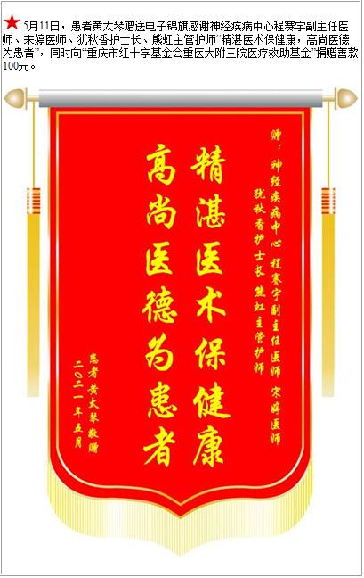 患者黄太琴赠送电子锦旗感谢神经疾病中心程赛宇副主任医师等人,并向医疗救助基金捐赠善款100元-锦旗-患者心声-患者服务-重庆医科大学附属第三医院【官方网站】