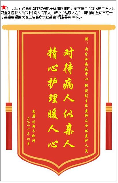 患者刘朝木赠送电子锦旗感谢内分泌疾病中心邹密副主任医师及全体医护人员,并向医疗救助基金捐赠善款100元-锦旗-患者心声-患者服务-重庆医科大学附属第三医院【官方网站】