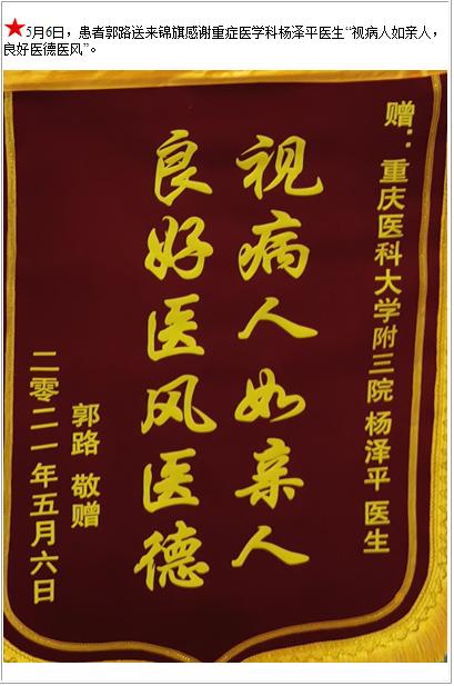 患者郭路送来锦旗感谢重症医学科杨泽平医生“视病人如亲人,良好医德医风”-锦旗-患者心声-患者服务-重庆医科大学附属第三医院【官方网站】