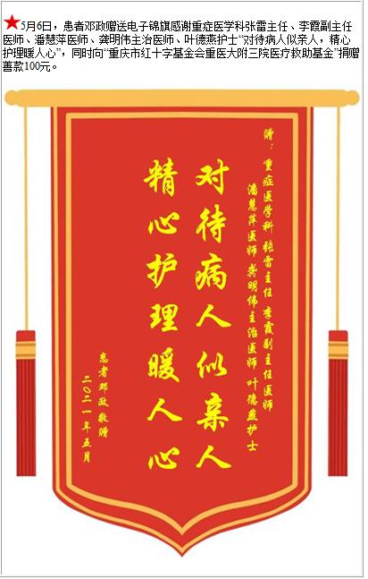 患者邓政赠送电子锦旗感谢重症医学科张雷主任等人,并向医疗救助基金捐赠善款100元-锦旗-患者心声-患者服务-重庆医科大学附属第三医院【官方网站】