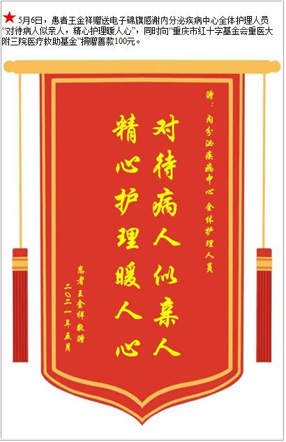 患者王金祥赠送电子锦旗感谢内分泌疾病中心全体护理人员,并向医疗救助基金捐赠善款100元-锦旗-患者心声-患者服务-重庆医科大学附属第三医院【官方网站】
