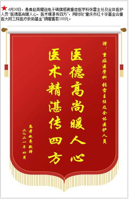 患者赵亮赠送电子锦旗感谢重症医学科张雷主任及全体医护人员,并向医疗救助基金捐赠善款100元-锦旗-患者心声-患者服务-重庆医科大学附属第三医院【官方网站】