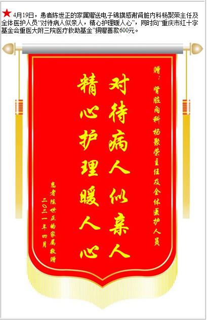 患者陈世正的家属赠送电子锦旗感谢肾脏内科杨聚荣主任及全体医护人员,并向医疗救助基金捐赠善款600元-锦旗-患者心声-患者服务-重庆医科大学附属第三医院【官方网站】