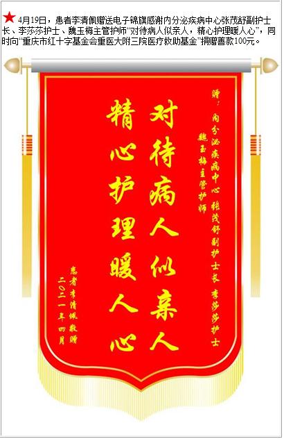患者李清佩赠送电子锦旗感谢内分泌疾病中心张茂舒副护士长等人,并向医疗救助基金捐赠善款100元-锦旗-患者心声-患者服务-重庆医科大学附属第三医院【官方网站】