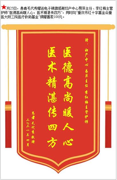 患者毛代秀赠送电子锦旗感谢妇产中心易萍主任等人,并向医疗救助基金捐赠善款100元-锦旗-患者心声-患者服务-重庆医科大学附属第三医院【官方网站】