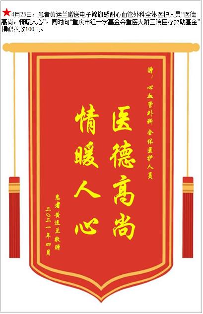 患者黄运兰赠送电子锦旗感谢心血管外科全体医护人员,并向医疗救助基金捐赠善款100元-锦旗-患者心声-患者服务-重庆医科大学附属第三医院【官方网站】