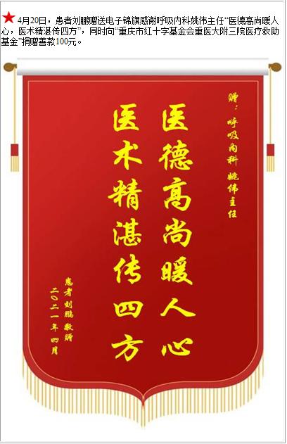 患者刘鹏赠送电子锦旗感谢呼吸内科姚伟主任,并向医疗救助基金捐赠善款100元-锦旗-患者心声-患者服务-重庆医科大学附属第三医院【官方网站】