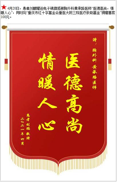患者刘鹏赠送电子锦旗感谢胸外科黄承路医师,并向医疗救助基金捐赠善款100元-锦旗-患者心声-患者服务-重庆医科大学附属第三医院【官方网站】