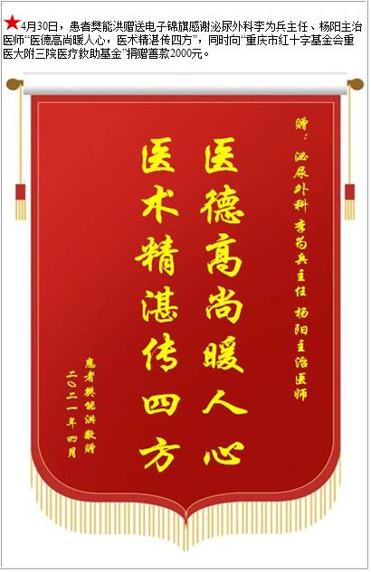 患者樊能洪赠送电子锦旗感谢泌尿外科李为兵主任等人,并向医疗救助基金捐赠善款2000元-锦旗-患者心声-患者服务-重庆医科大学附属第三医院【官方网站】
