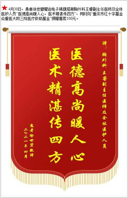 患者徐世碧赠送电子锦旗感谢胸外科王睿副主任医师及全体医护人员,并向医疗救助基金捐赠善款100元-锦旗-患者心声-患者服务-重庆医科大学附属第三医院【官方网站】